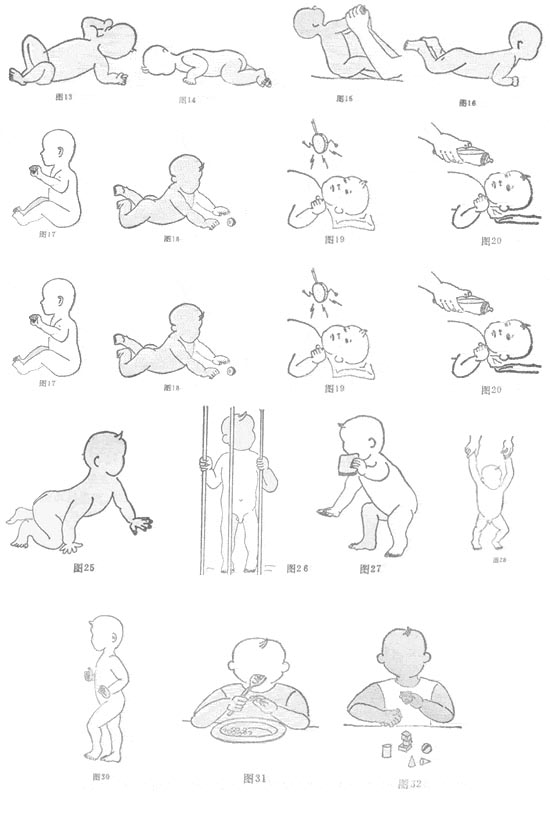 能一手支撑体重,可由仰卧位翻到俯卧位,扶成站立位 时能蹦跳(图24)。
