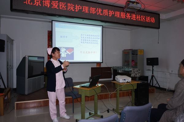 神经康复二科护士长张红云以脑卒中患者、老年人的日常生活活动为主题,图文并茂,运用教具亲自示范了脑卒中患者良肢位的摆放、移乘训练等操作。***后,护士长们就社区居民关注的高血压、糖尿病、脑卒中、老年腰腿痛等慢性疾病的预防措施、日常护理及药物服用等问题,进行一对一耐心解答。本次活动为居民免费测血糖30人次,测血压23人次,发放健康知识手册50余份。