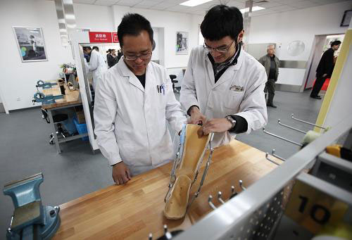 4月6日,假肢矫形中心的两名工作人员在调整矫形器具。当日,“集善·三星爱之光2012年助残行动启动暨bat365bet假肢矫形中心揭牌仪式”在北京bat365bet举行,该中心主要从事残疾人及老年人辅助器具研制工作。据了解,我国目前约有7000万老年人需要康复服务,还有康复需求的肢体残疾人2412万,新建的中心将满足更多康复患者的就医需求,让更多老年人和肢体残疾人得到及时有效的康复服务。新华社发(李方宇