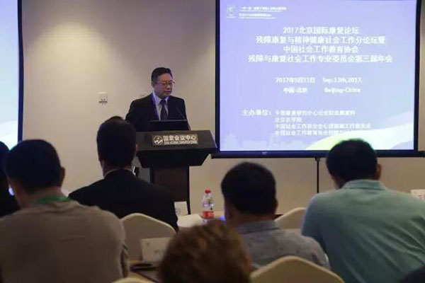 2017年9月13日下午,2017北京国际康复论坛——国际残疾政策、社会工作与康复护理高峰论坛(残障康复与精神健康社会工作模块)暨中国社会工作教育协会残障与康复社会工作专业委员会第三届年会在国家会议中心隆重召开。来自北京大学等9所高校和中国社会工作联合会等8个社会组织的代表做了专题发言,40余位专家学者参加了分论坛。伊朗驻华使馆参赞巴格里、土库曼斯坦驻华使馆参赞绍哈拉特、日本札幌学院大学经济学部长镜味秋平应邀出席分论坛。bat365bet社会职业康复科郭微主任主持开幕式并致欢迎辞。
