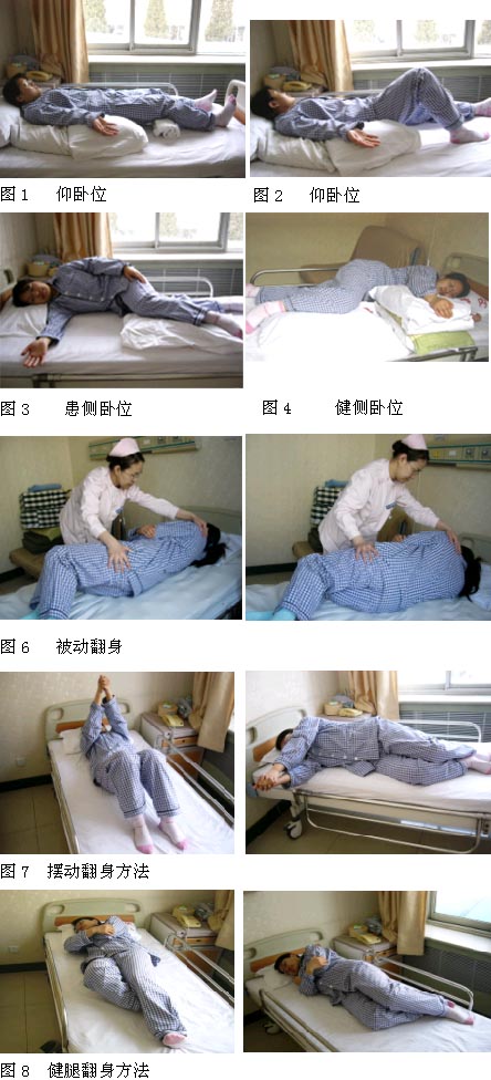 偏瘫侧骨盆后旋,患侧下肢外旋,同时也增也加了骶尾部,足跟外侧和外踝处褥疮的发生。作为一种替换体位或者患者需要这种体位时采用。当下肢肌张力出现时采用图2较好。(二)患侧卧位患侧卧位是所有体位中***重要的体位。该体位增加了知觉刺激,并使整个患侧肢体被拉长,从而减少痉挛;另一个明显好处是健手能自由活动。头部由枕支持感觉舒适,躯干稍向后旋转,后背用枕头稳固支持。患侧上肢前伸,肘伸直,前臂旋后,腕伸展,掌心向上,手指伸开。患侧下肢:健肢在前髋,膝屈曲用枕头支持。患肢在后,膝屈曲,踝背伸。(三)健侧卧位患侧上肢:放松前伸,放于枕头上,高于心脏,肩前伸,肘伸直,腕背伸,五指伸展。患侧下肢:在前稍屈曲放于软枕上,健腿在后自然屈曲。 二、翻身被动翻身:护士将患侧下肢屈曲,双手分别置于患侧肩部与臀部,用适当的力量将患者翻向健侧,随后将患肢置于良肢位。主动翻身:1、能伸肘的患者采用摆动翻身方法:患者取仰卧位,双手十指交叉,病手拇指放在健手拇指上方。向上伸展上肢,屈膝将双上肢摆向健侧,再摆向患侧,可以重复摆动一次,借助惯性,将身体翻向患侧。(图7)2、不能伸肘时采用健腿翻身法:患者取仰卧位,用健手将患肢屈曲置于胸前,并以健手托住肘部,将健腿插入患腿下方,借助身体向健侧转动的同时,趁势用健腿搬动患腿,翻向健侧。(图8)
