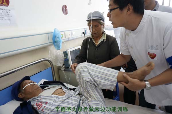 杜晓霞副主任医师为神经康复领域专家;李德盛康复师精通呼吸功能康复和肢体功能康复,带教经验丰富;凌华矫形师业务手法熟练,顶着烈日,为骨折患者制作矫形器。开展抗震救灾以来,医疗队队员们不怕累、不怕苦、积极努力、团结合作,云南省各级残联给予了医疗队良好的后勤保障服务。 开展康复评定 传授康复技能 康复医疗队对昭通市一院和中医院的地震伤员,采用mRS量表、Barthel指数量表,综合评定伤员的运动能力、心理状况、生活自理能力。在救治伤员的同时,康复医疗队队员还对当地医院的医护人员讲授了康复评价量表的使用方法,手把手地传授康复训练技能,以便对患者的功能进行全方位的评价,调整康复方案,评估康复预后,追踪患者的功能改善情况。告别时,当地医院的医护人员康复医疗队依依不舍,盛情挽留。 制定个体化康复治疗方案 鲁甸地震中的伤员以骨折、脑外伤、肺损伤患者居多,康复医疗队根据患者病情特点,分别为伤员制定了肺康复和肢体功能康复计划,向护理人员讲解了康复护理注意事项,并统计确定了地震伤员对手支具、腋拐、助行器、轮椅的需求量。 关爱地震小伤员的功能恢复